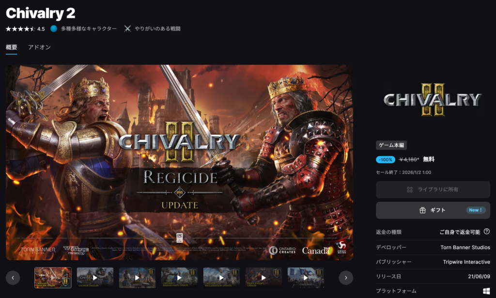 2026年1月1日にChivalry 2が無料配布されました