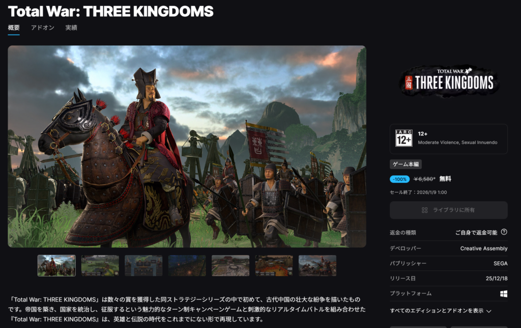 2026年1月2日にTotal War: THREE KINGDOMSが無料配布されました